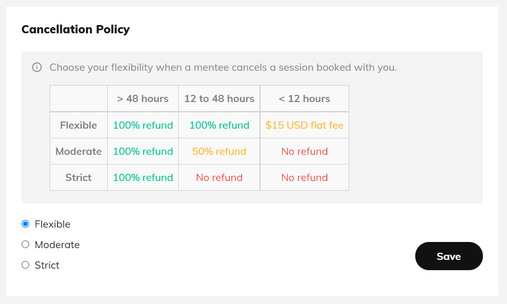 From your Payments tab, you're able to select your preference for a cancellation policy. Choose between flexible, moderate and strict policies for when a mentee has to cancel a session with you.