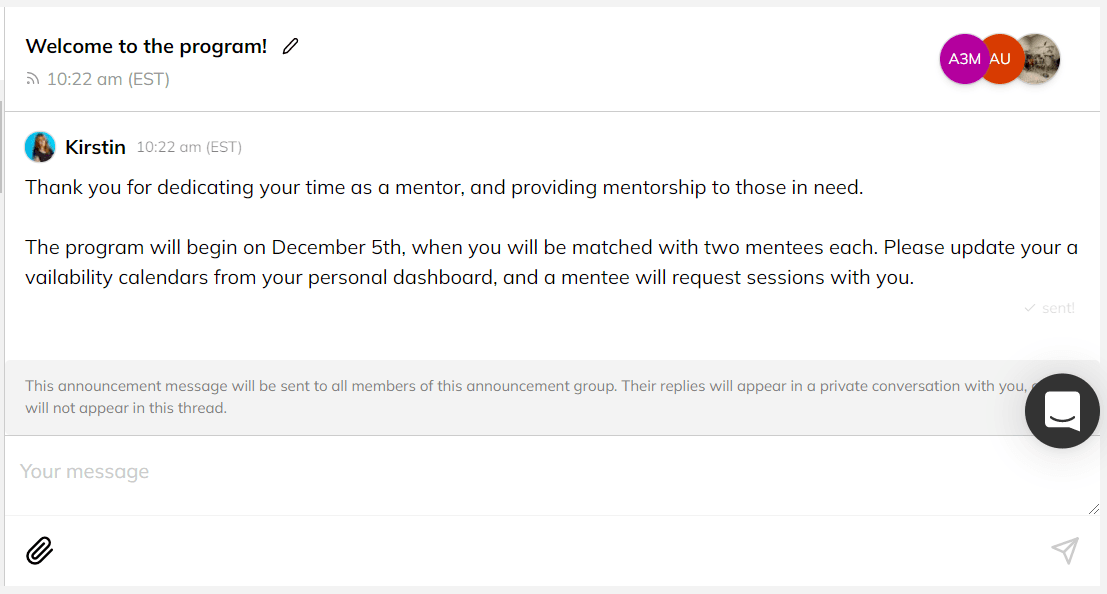 While managing your program, you're likely familiar with creating new conversations. These messages become an ongoing thread sent to all members in the conversation, and each member can reply in this thread - which is great for group discussions!