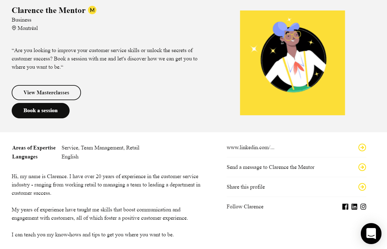 On their profile, you'll get to learn more about them including their areas of expertise and their bio.
