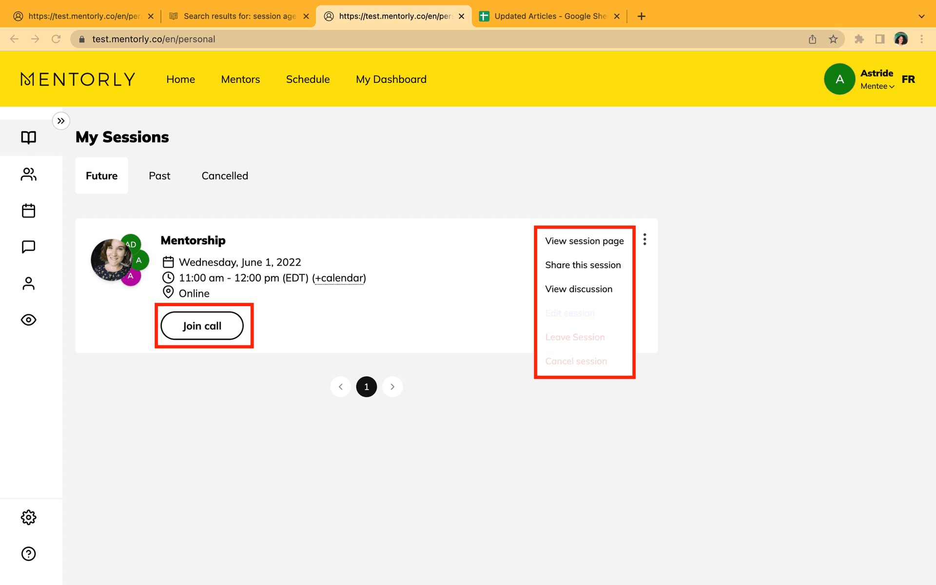 From the My Sessions tab, you'll be able to Join call 10 minutes before your session starts. You can also view session page, share the session, and more.