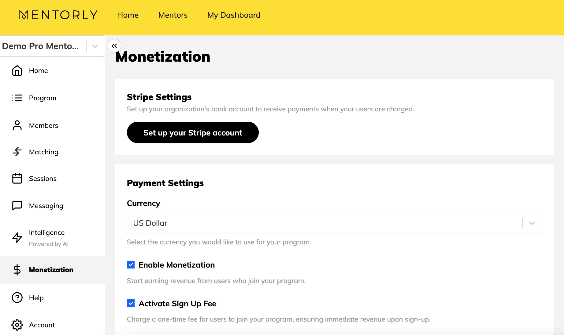 Monetization lets you turn your mentorship program into a revenue stream—seamlessly. With built-in Stripe integration, you can charge mentees through one-time fees or subscriptions, track payments with ease, and manage everything right from your Mentorly dashboard. Say hello to effortless billing and financial sustainability. Get into the details!