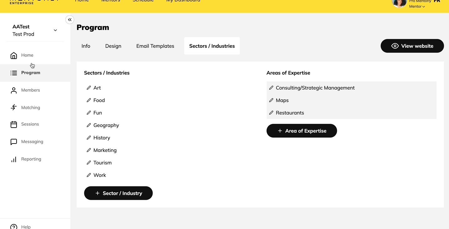 On the Sectors/Industries tab, you are able to add the sectors/industries and areas of expertise related to your mentorship program. When users onboard, they will choose from the list you created.