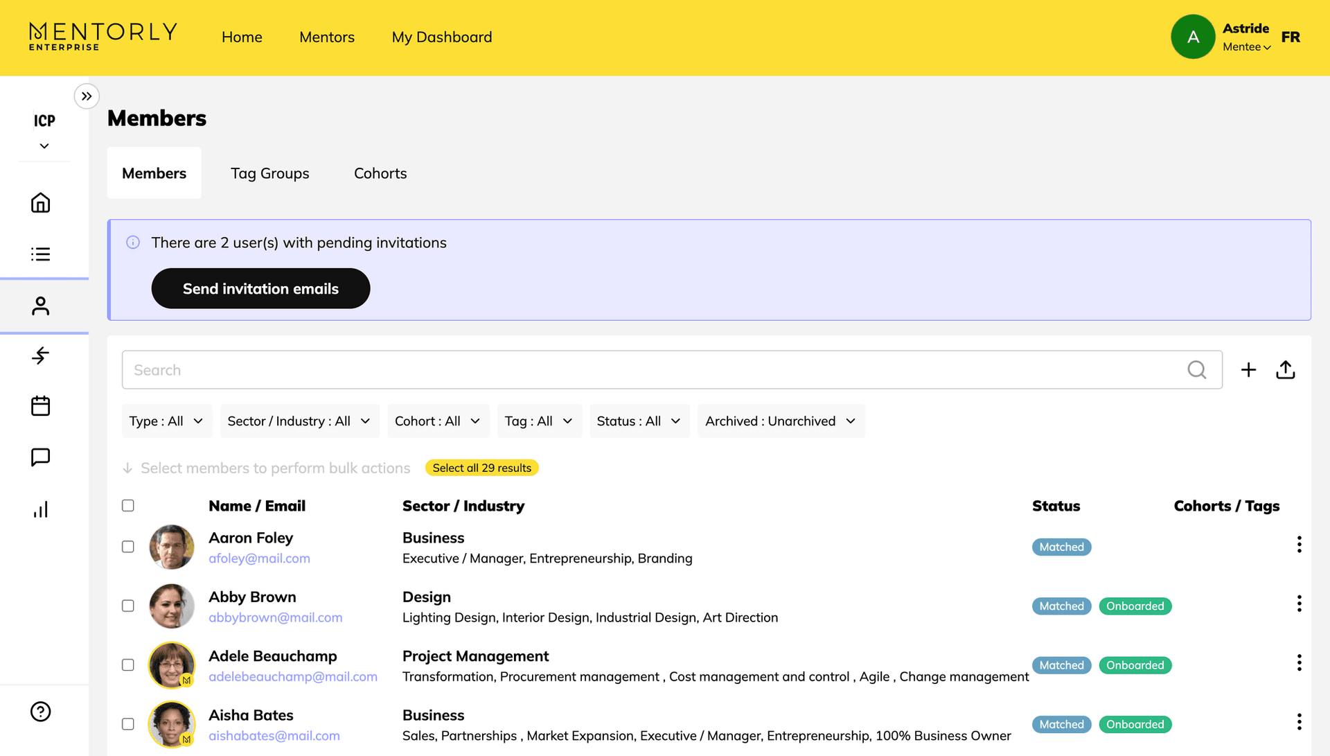 You can filter to view only mentors or mentees (or all), their selected industry, their user progress and their tags (if any).