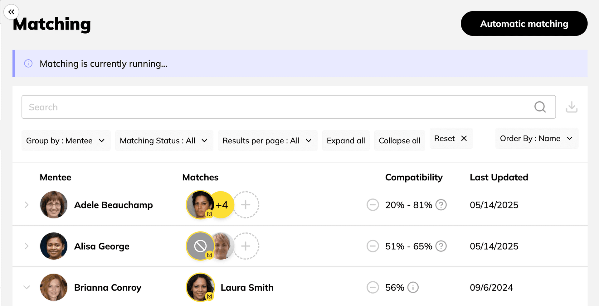 The Matching tab allows you to create, modify or delete matches for members in your program.