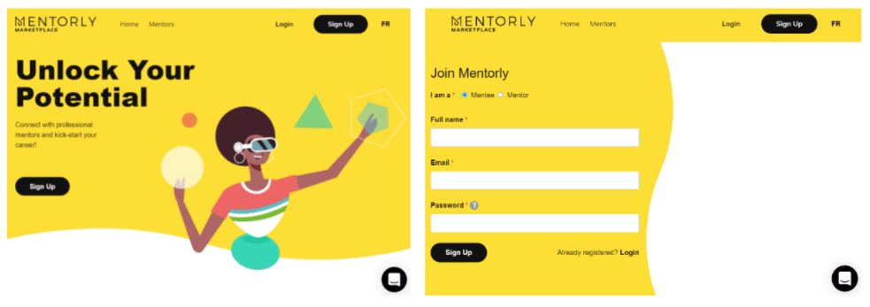 The first step is joining Mentorly! Head to https://marketplace.mentorly.co/en and click on the 'Sign up' button from the Marketplace homepage, then click the Mentee option.