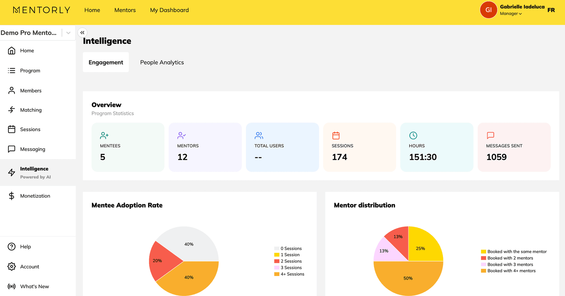 There are various different ways of determining engagement levels: mentee adoption rate, repeated sessions per mentor, session reviews and sentiment, or monthly sessions overview. Find what works for you and your program's needs!