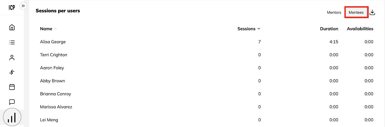 To identify mentees with a low session count, head over to the Reporting tab and scroll down to Sessions per users.