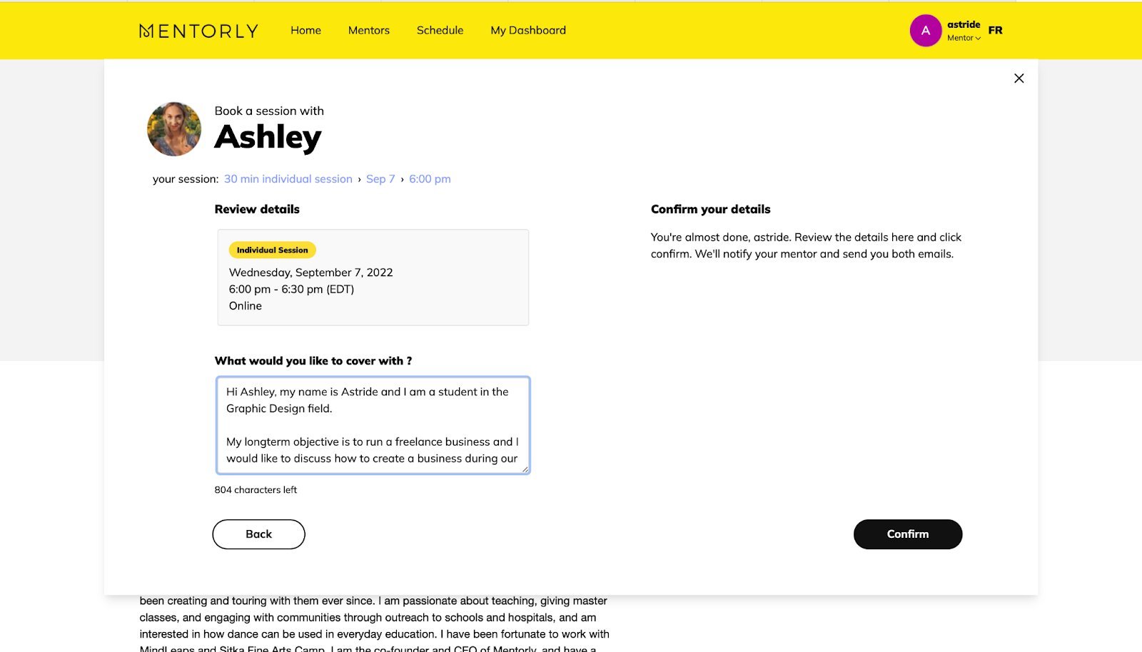 Perhaps you’re unsure how to make an agenda because you don’t know where to start or how it should look once completed. An agenda generally contains a list encompassing topics and talking points, as well as action items or activities to go over during a meeting. When you book a session with your mentor, you’re asked to list a few things you’d like to cover during your session.