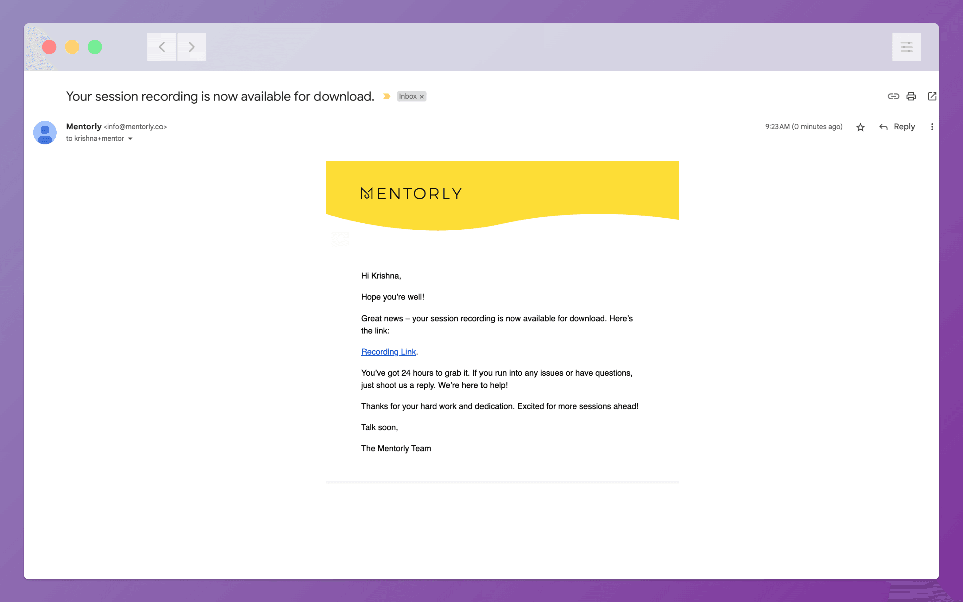 Shortly after ending the call, you will receive an email with a link to download the recording. This email will serve as your secure access point to the recorded session, allowing you to revisit the valuable insights and advice shared during your Mentorly experience.
