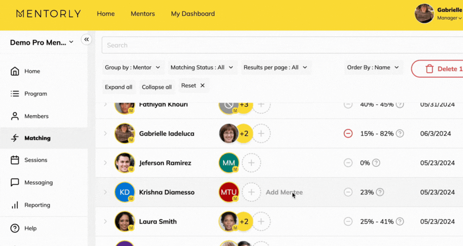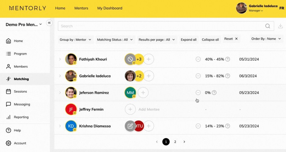 Automatic matching allows the Program Manager to automatically generate several matches at once with the click of a button by pairing up mentors and mentees with the highest compatibility scores.